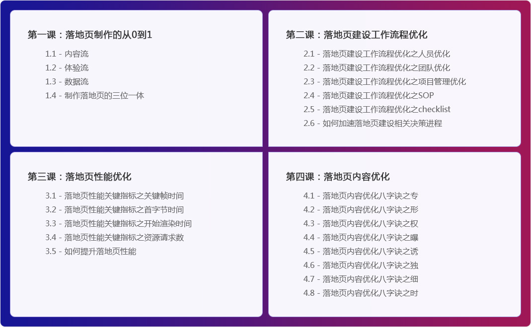 关于落地页制作与优化,最常见的问题就是“落地页优化怎么做?”而这几乎是一个老生常谈的话题。本套课程以落地页优化的过程为切入点,用简单的4堂课程来和大家做一简单的介绍和讲解。听完本次课程,你讲能实现落地页从0到1的突破。不仅在落地页的制作的落地页的优化,以及快速入手,如何提升信息流的转化率,和落地页的性能优化等相关知识。