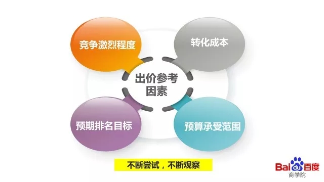 这里给大家举了四个关于给关键词出价可参考的因素: 1、竞争激烈程度 2、预期排名目标 3、预算承受范围 4、转化成本 01 这里说的是关于关键词的激烈竞争程度,在后台的关键词规划师工具中可以看到此项内容,蓝条越长、数字越大代表竞争激烈程度越高。如果我们选取的关键词竞争激烈程度较高也说明同行对这个词的关注度也就越高,对于这个词同行竞争比较激烈,企业需要考虑在保证出价的合理性同时可以达到比较好的转化效果。 02 预期排名越靠前预估的出价也相对来说会高一些,因为排名越靠前竞争越激烈,企业需要付出的成本也就越高。对于pc端和移动端来说,首页的位置都是比较好的,PC端的左侧和移动端的上方竞争更加激烈,用户关注度也比较高,企业根据可以自己的业务选择合理的关键词去竞争较优位置的排名。 03 如果一个关键词通过观察竞争激烈程度和企业的预期排名决定出价在30元左右比较合适,这时也要综合推广预算来合理分配价格,如果一天的预算是1000元,那此关键词可以出到30元,在预算充足的情况下该词有充足的展现机会;但如果企业预算只有100元的话,就要适当调整价格,保证推广的关键词可以有较充足的展现。 04 转化成本与消费和转化量相关,转化量恒定的情况下,消费越高转化成本越高。如果企业对于转化成本控制的比较严格的话,在关键词出价的时候也要合理考虑对消费的影响。 以上四点参考因素,在企业为关键词制定出价的时候,可以进行综合考量,合理给关键词进行出价。