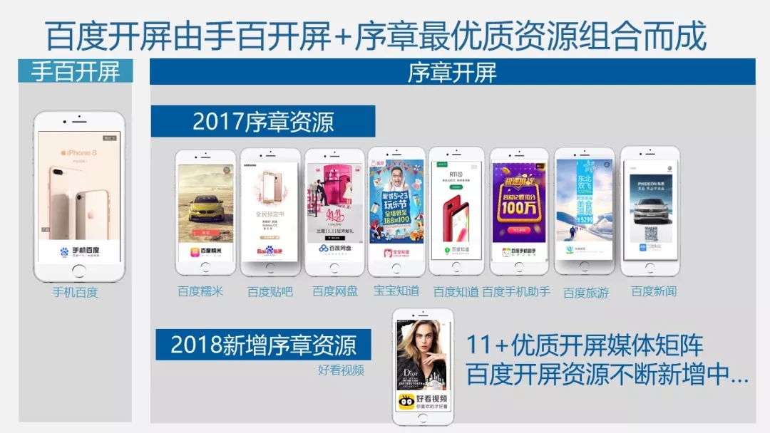 比如说在百度糯米百度贴吧,百度网盘宝宝知道,汇集百度,甚至百度旅游,百度新闻上我们也都会有我们的开屏的资源。我们统一把这种开屏起名为序章开瓶。在2018年的时候我们也新增了好看视频。所以到目前为止,百度开屏是指的有11家优质的开屏媒体资源矩阵所形成的开屏资源,当然我们这个资源还在不断的新增中。