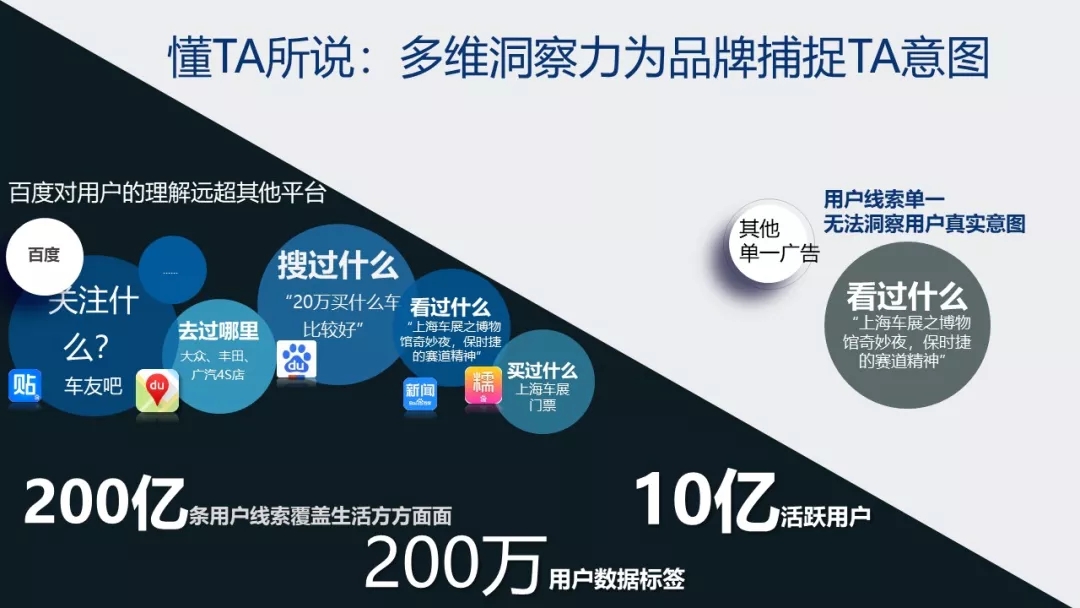 我们百度的使用的网民理解,进行分析的,呢我们来看一下。因为我们百度有很多的APP劝我们通,我们可以把这些APP矩阵上的搜索行为进行串联。比如说有一个网民他关注了车友吧,同时他也去过大众丰田广汽4S店,而且他在他还用百度手机百度去搜过“20万到底买什么车好”!如果他在百度新闻上还看到了上海车展这些信息,同时在百度糯米上也买了门票,那通过这一系列的行为分析,我们就会去分析出来。这个网民他是一个潜在的购买汽车的这种意向客户网民,那百度目前用200亿条这种用户线索,可以覆盖我们生活的方方面面。