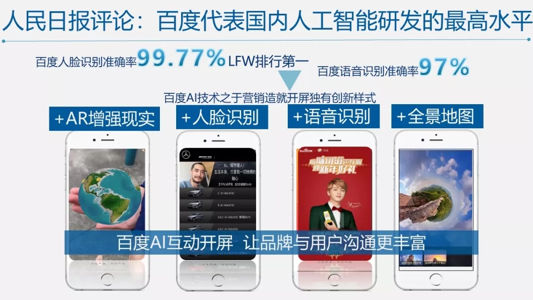 首先AR技术的创新,在这里给大家举了几个例子,一其实百度目前是代表了国内国内人工智能研发的一个最高水平,我们的人脸识别准确率已经高达了99.7%以上,语音识别也是准确率高达了97%,所有这些硬件技术的支持将决定了我们开屏广告,拥有我们的独立的这种创新的样式。