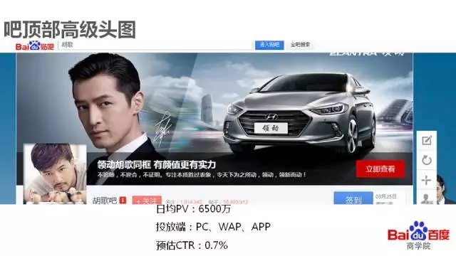 吧顶部高级头图可以在PC端,wap端,APP端三端来投放,曝光量是在6500万左右,预估CTR0.7%。