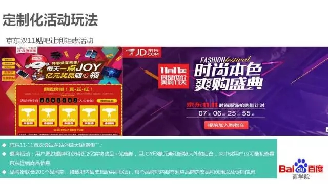 采用的是翻牌活动:用户通过翻牌可获得近2亿实物奖品+优惠券,且JOY形象元素和超级大礼包结合,未中奖用户也可随机查看京东促销商品信息 ,品牌街联合200个品牌商,搭载吧内抽奖活动共同联动,每个品牌吧内都有对应品牌的奖品和优惠以及促销信息。起到很好的品牌曝光及订单的转化。