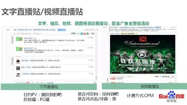 视频直播贴,区别于文字直播贴的互动模式,包含品牌的展现+实时互动,日曝光量要根据你投放的吧而定,投放端也是在PC端,可以定向到吧来投放,可以点击也可以外链,计费方式是CPM。