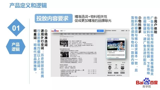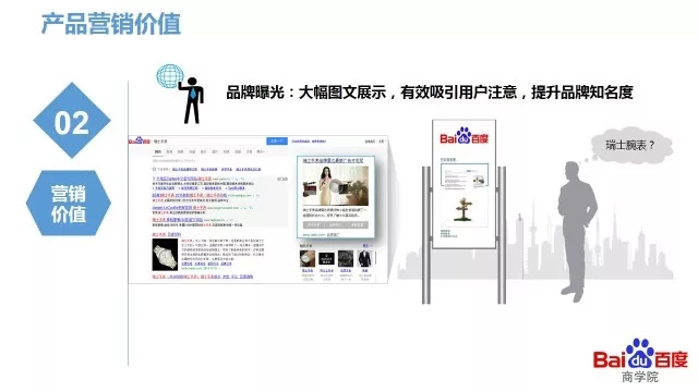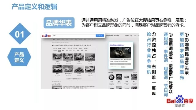 首先我们先来了解下品牌华表的定义,品牌华表通过通用词精准触发,广告展示在大搜结果页的右侧,并且是右侧唯一展现的广告内容,享受资源独占,吸引客户眼球,抢占行业先机。 通用词,事件词,明星词,节日词均能触发展现,通用词比如:智能手机、欧洲自由行、英语培训;事件词也可以是一些节目名称比如:极限挑战、爸爸去哪儿等; 明星词比如:鹿晗、杨幂等; 节日词比如:端午节、国庆节、圣诞节等; 多类别词汇均可触发展现,覆盖面更广泛,同时对受众进行精准曝光,影响消费者消费决策,为企业树立品牌形象的同时,满足企业对品牌营销的诉求。 品牌华表的产品逻辑是以企业主的诉求为出发点,帮助企业塑造品牌形象,在用户知名度和用户认可度两方面做大力推荐,同时我们对于广告主也有一定的要求,需要您是行业内的TOP广告主才有资格被品牌华表推荐。 同时对于投放内容也有要求,需要做到精准选词,保证和物料之间的相关性,才能达成更加精准的品牌曝光需求。 首先在选词方面,通用词建议选择在行业内历史投放表现在平均值以上的词;明星词建议选择明星代言品牌推荐,比如鹿晗代言了肯德基,肯德基又做了品牌华表并在词包里购买了鹿晗这个明星词,那当网民搜索鹿晗时,右侧华表就会显示肯德基的广告内容。 物料的要求需要保证内容与核心需求基本一致,且落地页要高度相关,必须要有与物料一致的内容展现; 最后要保证用户的体验度,需要广告主在选择物料的时候保证与所购的词包相关性强,如不符合要求,会建议广告主进行更改。 了解了品牌华表的产品定义和逻辑,接下来看下产品的营销价值。首先通过品牌华表广告主可以做到在右侧资源位强势展现,并且是唯一的展示可以做到独家垄断的效果,品牌价值凸显。 首先选择品牌华表需要购买词包,如果网民搜索的词在您所买的词包内,都可以展示您的品牌华表广告,这时企业就可以利用品牌华表右侧独家展现的优势,突出自己的品牌信息和产品特性,利用大图或视频等样式吸引用户注意,建立用户需求与企业品牌之间的联系,在深化品牌认知度的同时,吸引用户注意。 另外品牌华表的样式也有很多种,其中大幅的图文展示,可以有效的吸引用户的注意,提升品牌的知名度。 如果您想选择品牌华表的话,以下有五种展示样式可供选择。 图一为标准样式:含标题,展示LOGO图片,描述,和三条子链展示,以及下方的TAB展示; 图二为大图轮播样式:特点是中间图片部分面积更大,可以多张图片轮播展示,最多添加5张图片,最少添加2张,此样式可以更加突出多产品的展示内容。 图三为视频样式:中间较大面积展示企业视频,需要注意的是视频长度在30秒以内; 图四为大图浮层样式:鼠标点击查看大图,图片会以浮层样式展示,大小大概为屏幕的16分之9。 最后一种为多图样式,每张图片下面可以添加子链,跳转到企业网站的不同落地页。 以上五种展示样式,企业可以根据自己的品牌调性,产品特点,自由选择更适合企业的推广样式。 最后我们来看下欧莱雅做品牌华表时的案例。欧莱雅这个品牌大家都不陌生,它源自法国算是美妆行业的佼佼者,到2000年的时候,欧莱雅在中国50多个大城市建立了870家专卖店,后来随着互联网的兴起,欧莱雅积极拥抱变化,进而利用互联网做更大的商业布局;在2015年的时候,欧莱雅选择了品牌华表这种广告形式推广企业品牌,在短时间内大幅提升了用户关注度,点击率更达到了9.12%,品牌曝光效果显著。