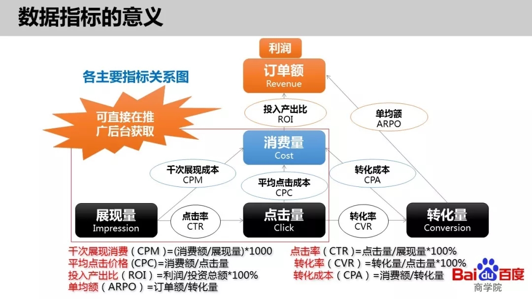 在推广中会时常会遇到没有同行的效果好,没有人来咨询我,没有电话,各种各样的问题。这时候大家可能会去找管理员去解决。问一下行业数据等等,还有一部分客户会在账户中进行一些优化去解决,实际上我们的后台需要一个整体的优化思路来指导优化。 有效的优化可以通过问题点去找到原因,那这个原因怎么去找,不是我们自己想到的,而是通过数据对比分析观察才可能找出问题所在,数据分析的越细越能准确找出问题。这堂课给大家带来的内容是数据指标的分析。 转化漏斗对象的数据指标 这个转化漏斗是搜索引擎网民转化的过程,我们看下每个阶段对应的数据指标。 1、推广阶段,涉及到的数据有展现量,点击量,消费额,点击率,平均点击价格。 2、网站阶段,这个时消费者已经脱离了百度,开始进入到了企业的网站了,网站阶段涉及的数据指标有访客数,抵达率,跳出率。网站对我们最后的转化也是一个很重要的阶段。 3、销售阶段,关系到我们的转化量,转化这里面涉及到的数据包括转化量,转化率,平均转化成本,订单额,投入产出比。那今天给大家分享的是百度推广指标和销售指标两个方面。 数据指标的意义 百度推广阶段优化指标 ◤ 展现量:就是广告被展现给网民的次数,多少人看到广告? ◤ 点击量:广告被网民点击的次数。 ◤ 点击率:在这个指标里面是最重要的一个数据,点击率=(点击量/展现量)*100% ,他代表了广告的吸引力。为什么说这个数据是最重要的,平常大家说优化的时候,经常会和管理员提到说我的这个词的什么不高,质量度不高,我要去优化,那质量度怎么去优化,影响质量度最重要的因素是什么?点击率。所以这个数值对大家来说很重要。 ◤ 消费额:是广告被点击产生的消费,也就是我花了多少钱。 ◤ 平均点击价格:平均每次点击是多少钱,消费量/点击量。这些数据在我们的后台是直接可以看到的。 销售阶段优化指标 ◤ 转化量:指客户完成一次您期望的行动。那如何来评估我们的转化呢,每家企业对于转化的定义不一样,有的客户认为网民咨询了就是转化了,有的客户认为只有有了订单,网民把钱给了企业主了,才是转化,同时还有企业认为浏览量或者是注册量也是转化量。其实转化量就是您希望网民在您网站上做哪些行为就可以把他定义为转化就行。 ◤ 转化率:实现转化的比率,等于(转化量/点击量)*100% ◤ 平均转化成本:是每实现一次转化的花费?等于(消费量/转化量) ◤ 订单额:通过百度推广获得的订单总销售额,也就是我一共卖出多少钱?大家要注意的是这里是没有抛出去成本的,并不是我们的利润。 ◤ 单均额:每一单平均多少钱,用订单额/转化量。 ◤ 最后来看下投入产出比:也就是我们平时说的ROI,他的公式是=利润比上投资总额,乘以百分百,可以帮助我们看下我们打广告是不是赚钱?如果我的投入产出比小于1了,那是不是说明我们是赔钱的,也就是说我们的投资总额大于利润了,那反之,我们就是赚钱的。 数据指标之间关系图 点击率 ( CTR )=点击量/展现量*100% 平均点击价格 (CPC)=消费额/点击量 转化率(CVR)=转化量/点击量*100% 投入产出比(ROI)=利润/投资总额*100% 单均额(ARPO)=订单额/转化量 转化成本(CPA)=消费额/转化量