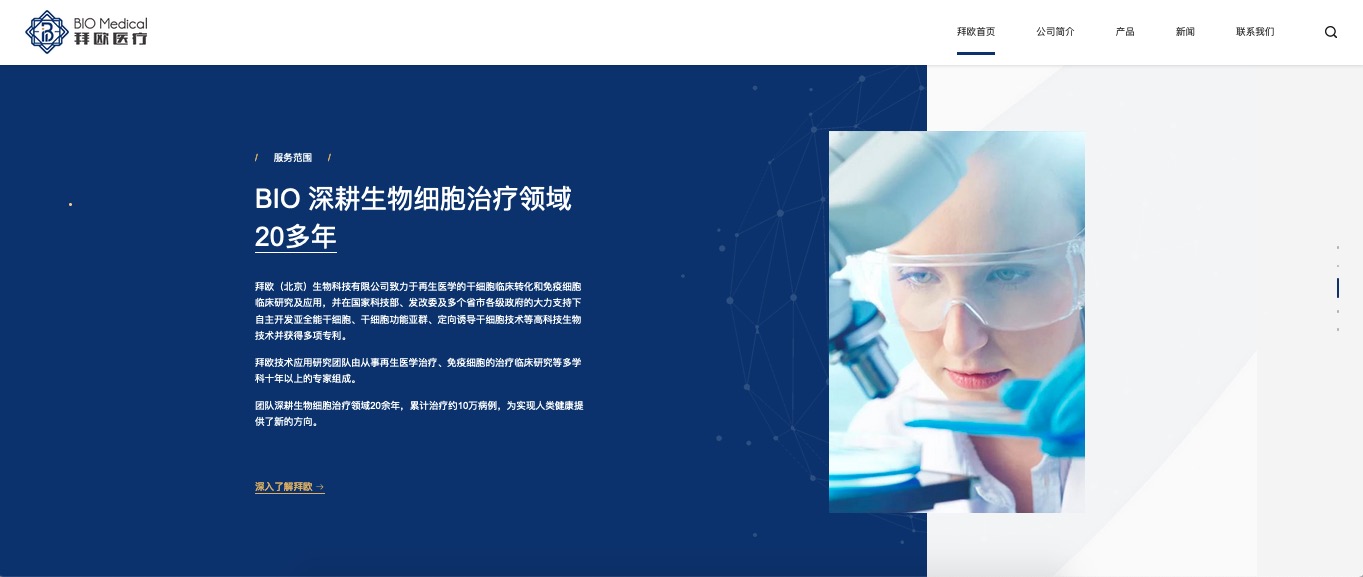 拜欧医疗自成立以来,得到了国家科技部、发改 委及多个省市各级政府的大力支持,在北京、河北、 河南、陕西等省份建设有4000 ㎡独立整体千级、局部 百级GMP标准实验室。下设细胞存储库、免疫细胞实 验室、科研实验室、检验实验室、质控实验室、PCR 区、细胞技术应用临床研究中心等。