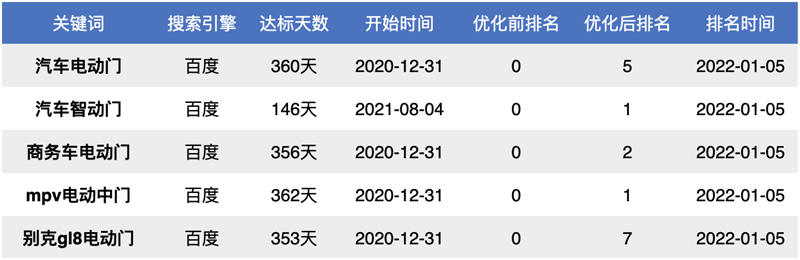 经过对网站的调整客户提交11个关键词,集中在汽车电动门这个核心关键词,出词率达到100%。