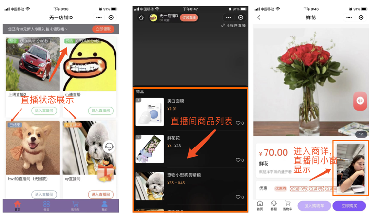 小程序直播入口及主要功能:
