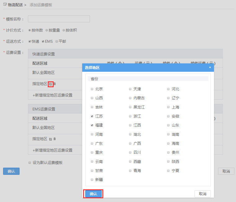 a. 点击指定地区右下角的“编辑”按钮,显示省份选择列表勾选框
