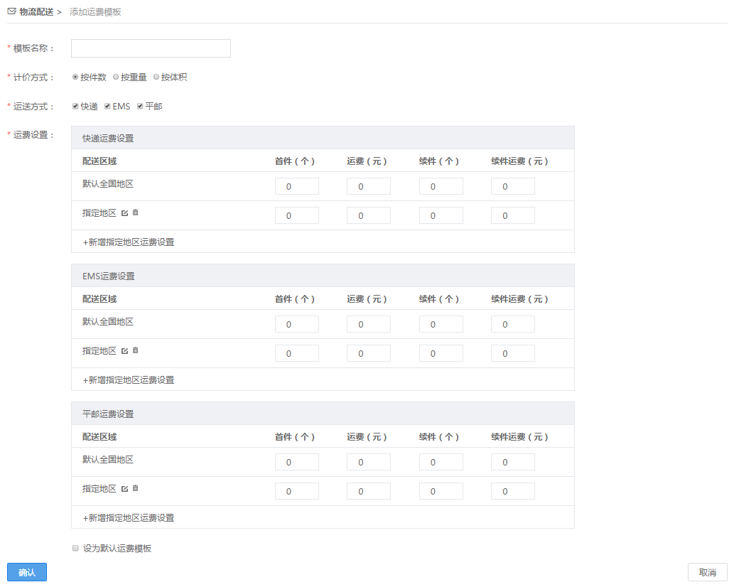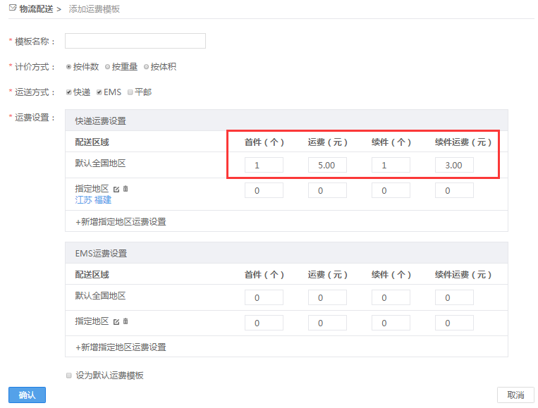 3. 填写模板名称、选择计价方式、运送方式