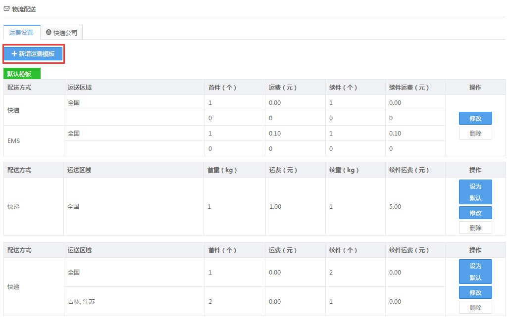 后台可以创建多套运费模板,商家根据运营情况,设置默认使用模板。