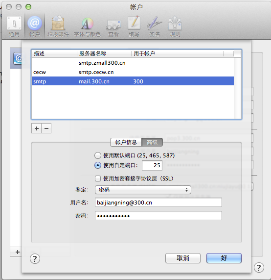 选择SMTP,点击【高级】,使用自定端口设置为:25 鉴定为:密码 显示/输入完整的用户名及密码