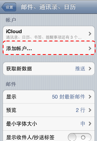 第三步,在【邮件、通讯录、日历】选项中,选择【添加账户】.