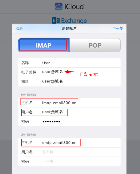 2)收件服务器中:a)主机名称输入:Z云邮的业务域名imap.zmailpcb-lib.com或者输入imap.客户自己公司域名;