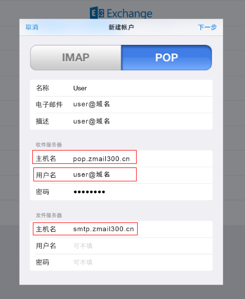 当设置为POP类型的帐户时: