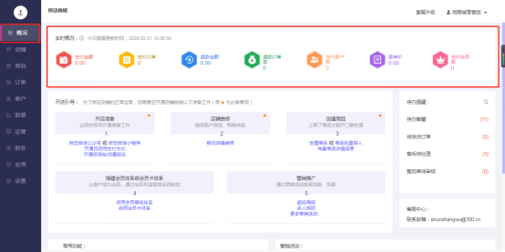 通过概况数据,您可以直观查看关键的实时数据指标:支付金额、支付订单、退款金额、退款订单数、支付客户数、客单价、支付会员数。