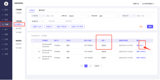 操作路径:概况-待办提醒-待发货订单-点击( 6 )跳转到订单发货列表-点击发货-填写物流信息-发货: