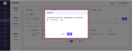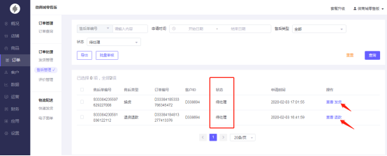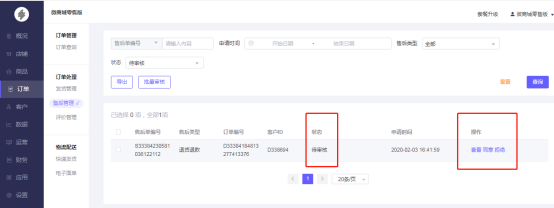 操作路径:点击概况-待办提醒-售后单待审核-点击(6)跳转到售后管理列表-点击“同意”或者“ 拒绝”: