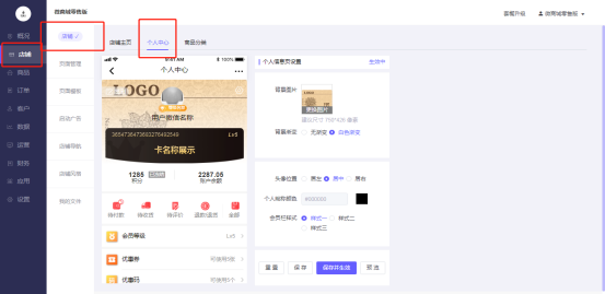 点击导航中的个人中心,您可以对个人中心进行设置,可以自定义设置背景图片、会员栏样式、会员等级和优惠券等。