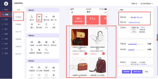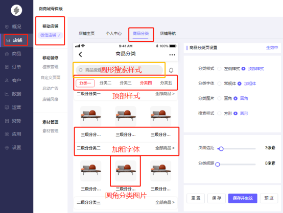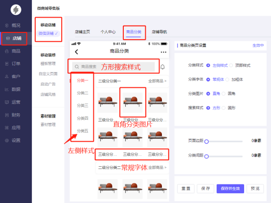注:商品分类设置页面不能直接显示商品分类图片,仅显示排版样式。
