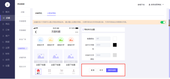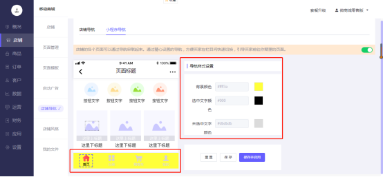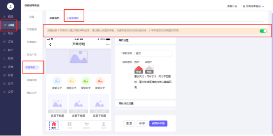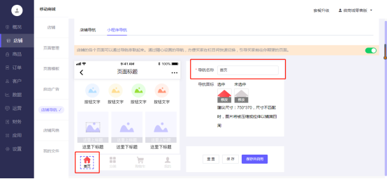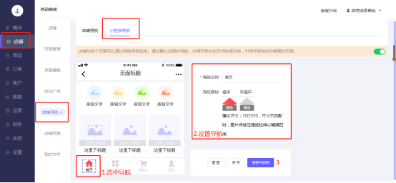 操作路径:微商城电脑端后台-店铺–店铺导航-小程序导航-选中导航-进行导航设置:
