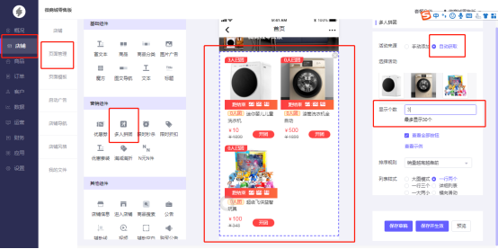 自动获取后台创建好的拼团活动,无需手动选择。您可以根据自己的需求场景来设置首页面显示个数等;不同的勾选有不同的展示,在勾选之后会立马出现在效果图中,您可以查看预览效果。