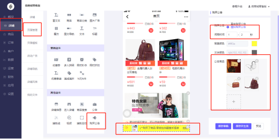 手动选择后台创建好的商品,作为公告商品。您可以根据自己的需求场景来设置间隔时间、背景颜色、文字颜色;不同的设置有不同的展示,在设置之后会立马出现在效果图中,您可以查看预览效果。