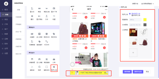 手动选择后台创建好的商品,作为公告商品。您可以根据自己的需求场景来设置背景颜色、文字颜色;不同的设置有不同的展示,在设置之后会立马出现在效果图中,您可以查看预览效果。