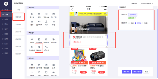 操作路径:微商城电脑端后台-店铺–页面管理–新建页面或编辑页面-添加“满减满折”组件: