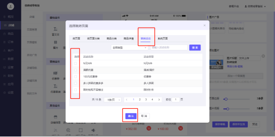 操作路径:微商城电脑端后台-店铺–页面管理–新建页面或编辑页面-添加“图片广告”组件-添加设置好的图片-选择跳转到页面-选择营销活动-确认: