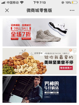 图片广告用于页面排版,一般用来做顶部的banner,推荐宽度305px,高度根据banner需要来设定就可以了,多张banner展示时需要保持每一张图片的高度宽度一致,不然会导致有白边的情况;轮播海报推荐展示在三张以内,考虑到买家在一个位置这里停留的时间不会过长。