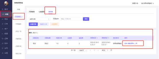 注意: 做好的页面,一定要点击【保存草稿箱】,如果要离开当前页面,离开将不会保存。可在店铺-页面管理-草稿箱-页面列表查看创建好的页面,进行复制、编辑、删除、上架等操作。