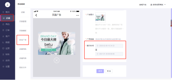 注:如果您设置了启动广告的展示时间,那么启动广告会按照设置好的时间段生效。