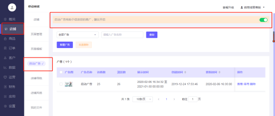 新建了启动广告后,您需要到店铺-启动广告-启用这个功能,启动广告才能在店铺主页中弹出。