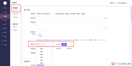1)在商品-商品列表-新建商品-商品分类-选择商品分类