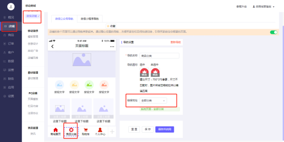 3) 商品分类是个页面,在店铺-微信店铺-微信公众号导航或者微信小程序导航-添加商品分类导航,添加方法如下图: