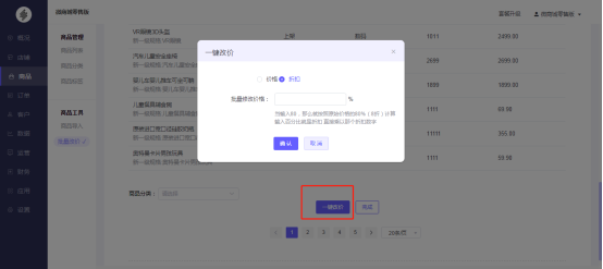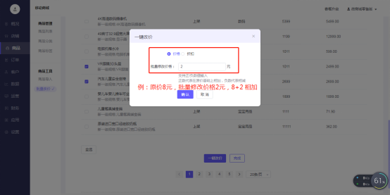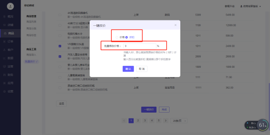 2、点击批量改价-选择需要批量改价的商品或者全选商品-一键改价-可以选择改价类型,目前支持价格和折扣,支持正/负数值输入,正数代表在原价基础上相加,负数代表相减。