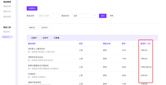 1、批量改价可以更改出售中、仓库中、已售罄中的商品价格。