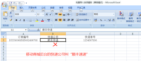 注:批量导入发货表格里快递公司名称和已对接快递公司必须规范一致。例如,已对接快递公司列表是显示的“顺丰速递”,如果您在发货模板里填写“顺丰快递”,会导致发货失败哦。