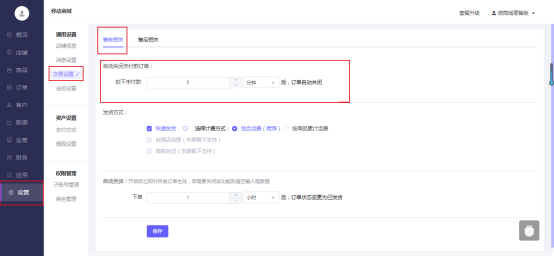 移动商城电脑端后台 - 设置 – 通用设置 - 交易设置 – 售前相关-自动关闭未付款订单