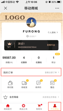 3、买家关注商家微信公众号后,点击底部菜单栏的【个人中心】-【我的订单】,即可查看自己的订单;