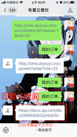 2、买家关注商家微信公众号后,可以发送【我的订单】到微信公众号,系统会自动将个人中心链接发送给买家,引导进入;
