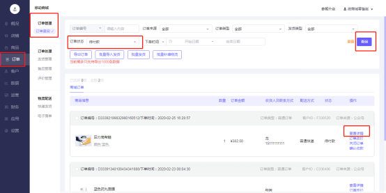 登录移动商城电脑端后台 - 订单 – 订单管理- 订单查询- 订单状态:待付款 \待发货– 查询 – 查看详情-修改收货地址
