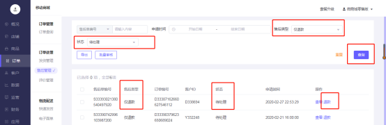 选择售后类型:仅退款,选择状态:待审核-点击“查询”,筛选出待审核的售后单,点击“同意”仅退款:
