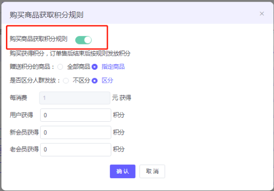 开启购买商品获取积分规则,并设置赠送积分的商品、是否区分人群发放等规则: