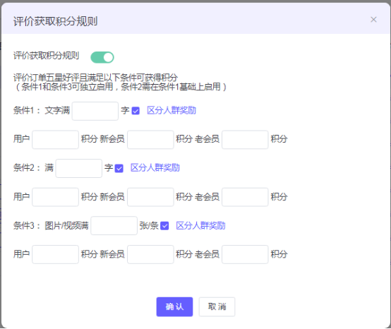 开启评价获取积分规则,并设置评价订单五星好评且满足条件可获得积分: