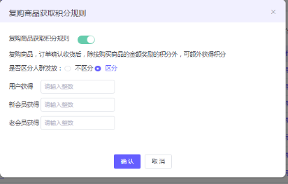 开启复购商品获取积分规则,并设置是否区分人群发放等规则:
