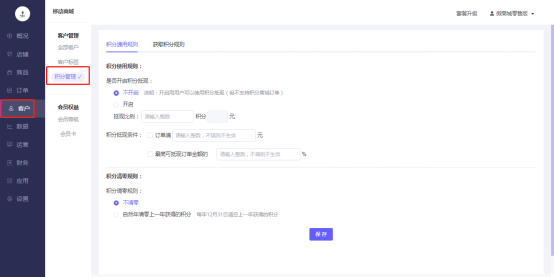 移动商城电脑端后台-客户-客户管理-积分管理-积分通用规则