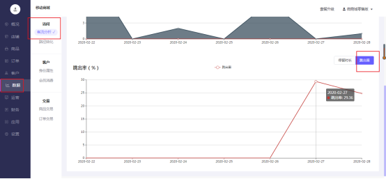 根据不同时间段,点击渠道按钮【全部】【公众号】【小程序】【pc】【wap】,可区分渠道查看顾客的跳出率